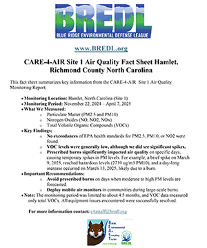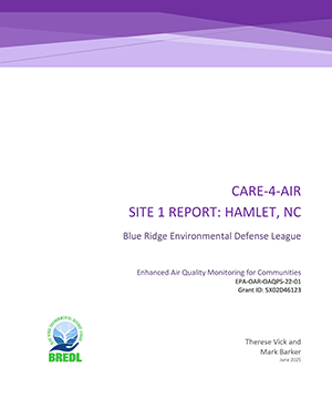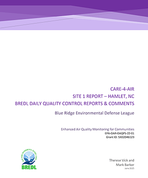 BREDL has completed our air monitoring at a site in Hamlet North Carolina, which is in Richmond County. Our Site 1 report details our findings and provides information on the facilities near the site, as well as activities that could impact air quality in the community. There is an accompanying report which gives additional technical information. We are thankful to the Hamlet site host.